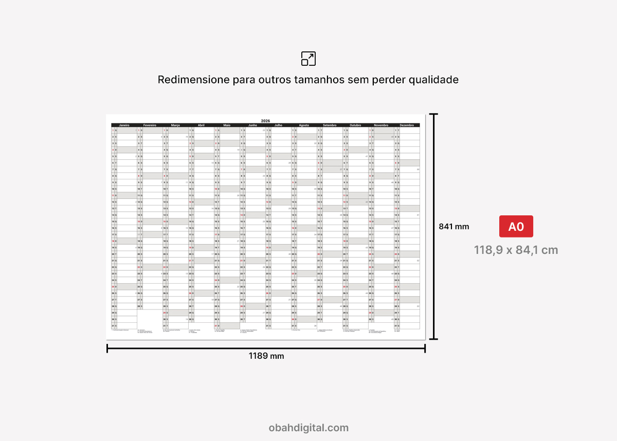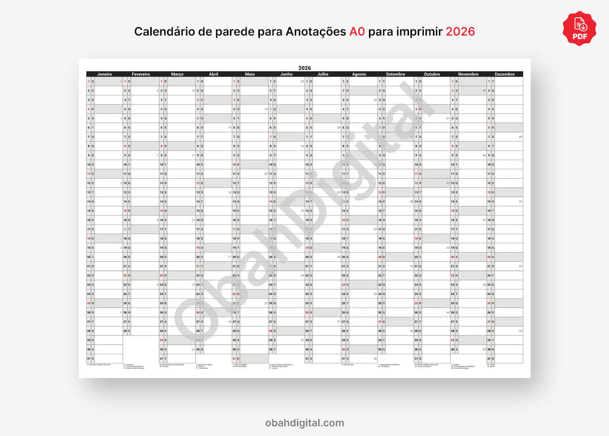 - 01 PDF com Calendário do ano de 2026 em formato A0 (84,1 por 118,9 cm) COLORIDO.
